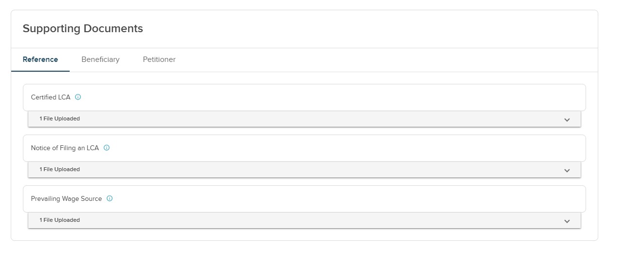Reference documents such as the receipt notice, approval notice, and certified LCA will appear under a dedicated section titled Reference Documents. These documents may be needed for company records, per employee request, etc.