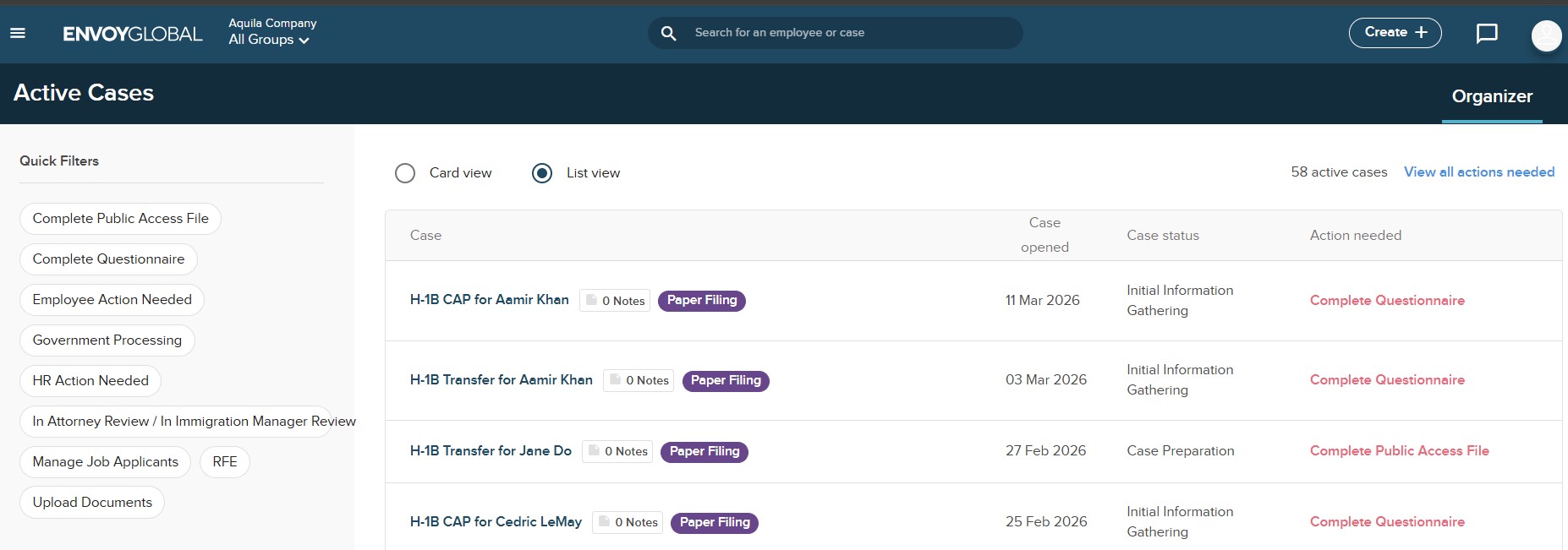 The Active Cases tile provides company users with a list of all current cases, statuses, and any required actions. Select the Active Cases tile on the Envoy home page to begin. This tile helps companies stay organized while managing ongoing casework in the Envoy Global platform.