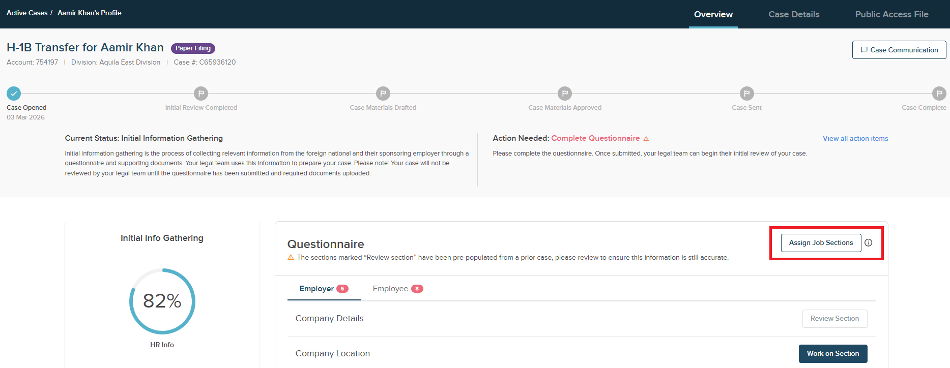 - Click on an active case in questionnaire status. Use the Assign Job Sections button in the top-right corner.