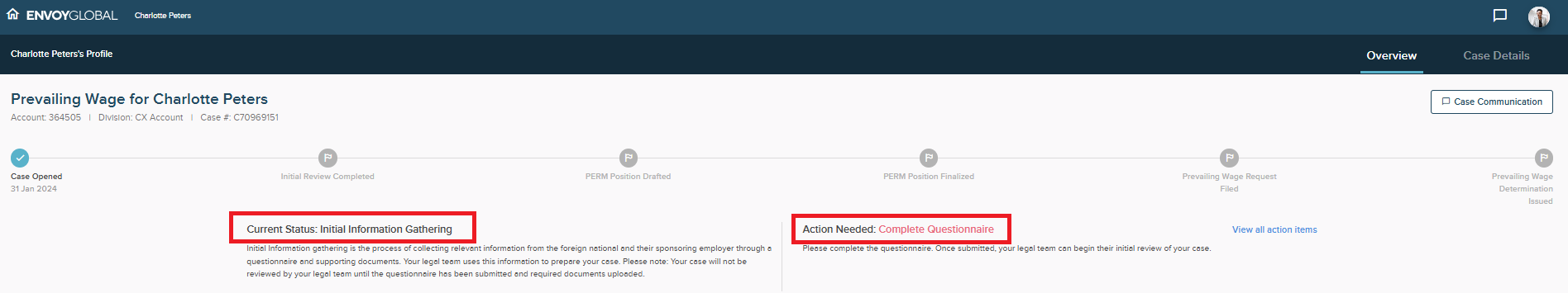The initial information gathering stage is typically the first step of any case opened in the Envoy Global platform. There are portions of this stage that may require action from the employee or other parties, such as the sponsoring employer. When all required actions are completed to 100% for this stage, the case will be ready to submit to the legal team's review.