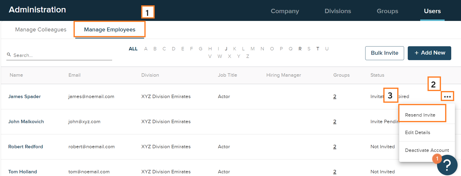 Select the Manage Employees tab. If you're resending an account invitation for a colleague user, navigate to Manage Colleagues instead.